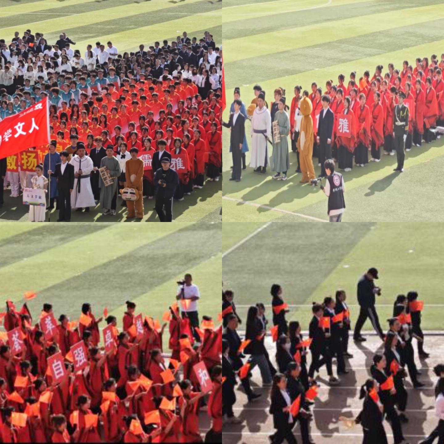 运动会的开幕式上,彩旗飘扬,欢呼声如潮。人文学院代表队身着汉服,承载着历史与文化的厚重,走入赛场,彰显了人文学院的独特魅力。青春的活力与春日的蓬勃在此刻激情碰撞,点燃了全场的热情。