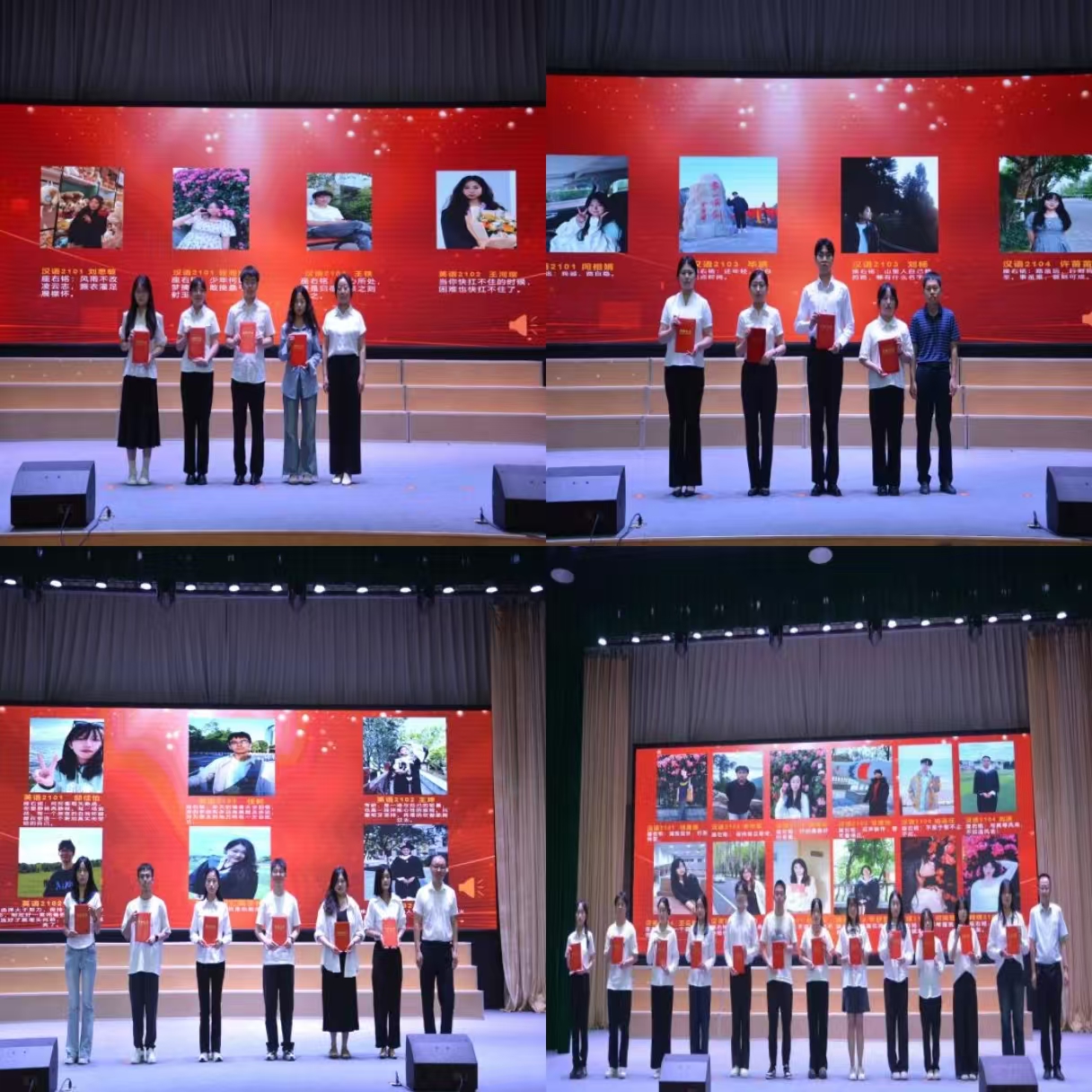 表彰大会上,王刚、赵萍君、刘玉婷、景宇四位老师倾情朗诵了赵萍君副教授创作的诗歌《鹤城的风,吹过你们的梦》,表达了老师们对毕业生的依依不舍与深情祝福。同学们带来的歌曲《我相信》、舞蹈《爱出发》释放了无限的青春活力,表达了对毕业生的美好祝愿。受表彰的同学们为全体教师献上了美丽的花束,表达他们对母校和老师的祝福与感恩之情。