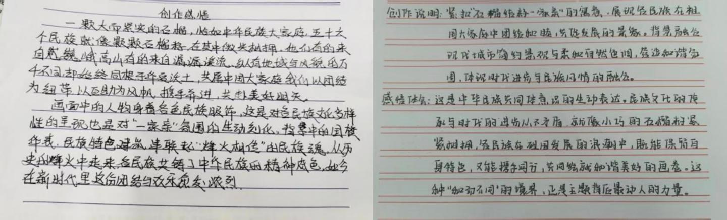 团总支、学生会举办“ai 聚力·共绘民族同心圆”创意比赛,鼓励2025级学生运用多样化的艺术形式,表达对民族团结的理解。同学们书法作品笔力遒劲,挥毫泼墨间书写着“民族团结一家亲”的坚定信念;图文并茂的手抄报和创意剪贴画,生动呈现了各民族文化的丰富多样与交融互鉴,借助生成式人工智能app,同学们将个人思考呈现为一幅幅既充满现代科技感又不失艺术魅力的画作,为传统艺术创作注入了新鲜活力。