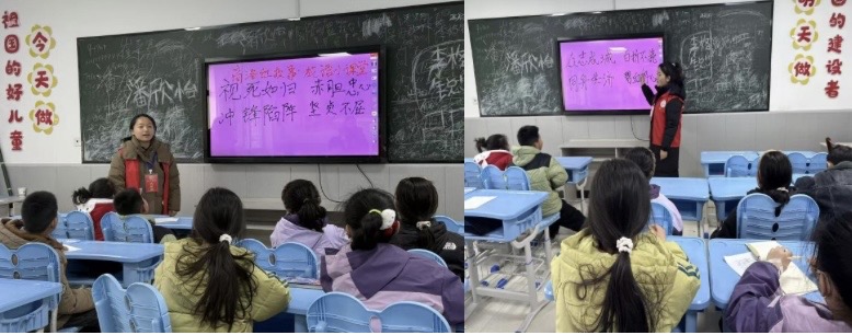 2025年12月14日,人文学院党委学生第一党支部再次组织志愿者走进东店子小学,开展“党史进校园,红色润童年”系列红色宣讲活动。本次活动在延续首场活动良好互动模式的基础上,创新采用“成语 烈士事迹”的宣讲形式,让党史故事以更生动、更贴近少年儿童认知的方式“活”起来。